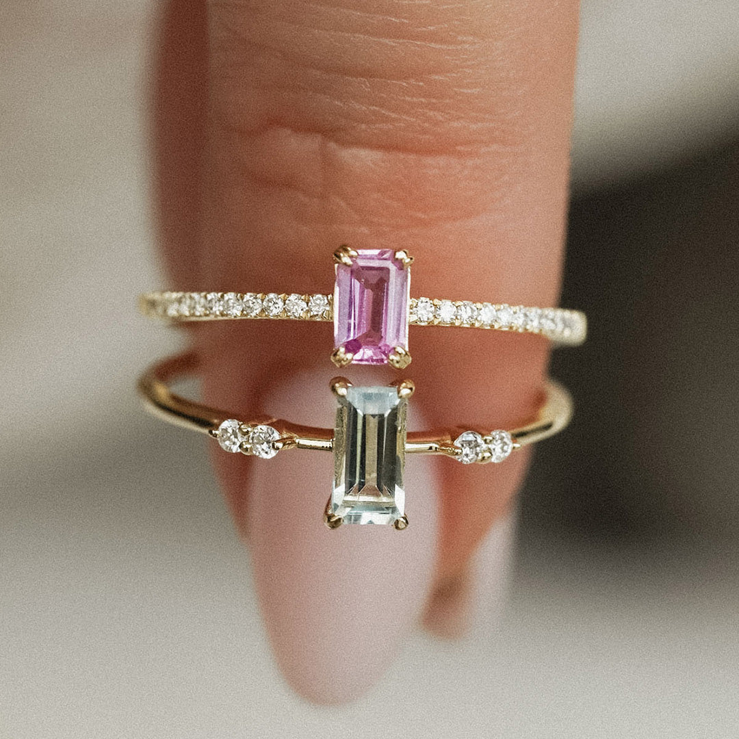 Seraphine | 14K Roze Baguette Saffier & Diamant Pavé Ring