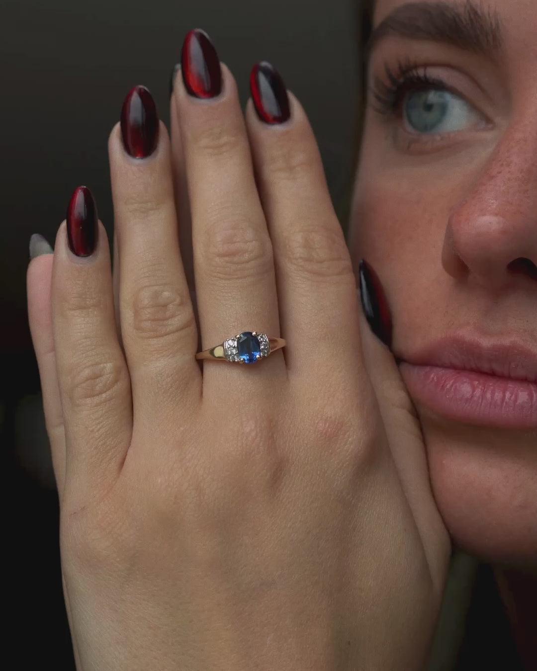 This vintage kyanite & white sapphire Three-Stone Ring has an elegant and balanced design in which the kyanite takes center stage, flanked by zircon stones. The Three-Stone Ring setting gives the jewelry a refined look with a beautiful color contrast and a timeless character.