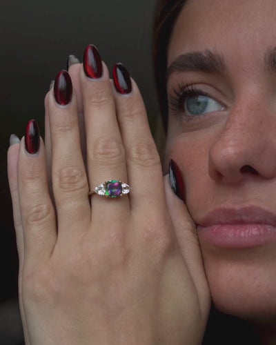 This vintage mystic topaz & topaz Three-Stone Ring has a striking and playful design in which the mystic topaz takes center stage, flanked by topaz. The Three-Stone Ring setting creates a dynamic play of colors and an elegant balance with a distinct vintage look.