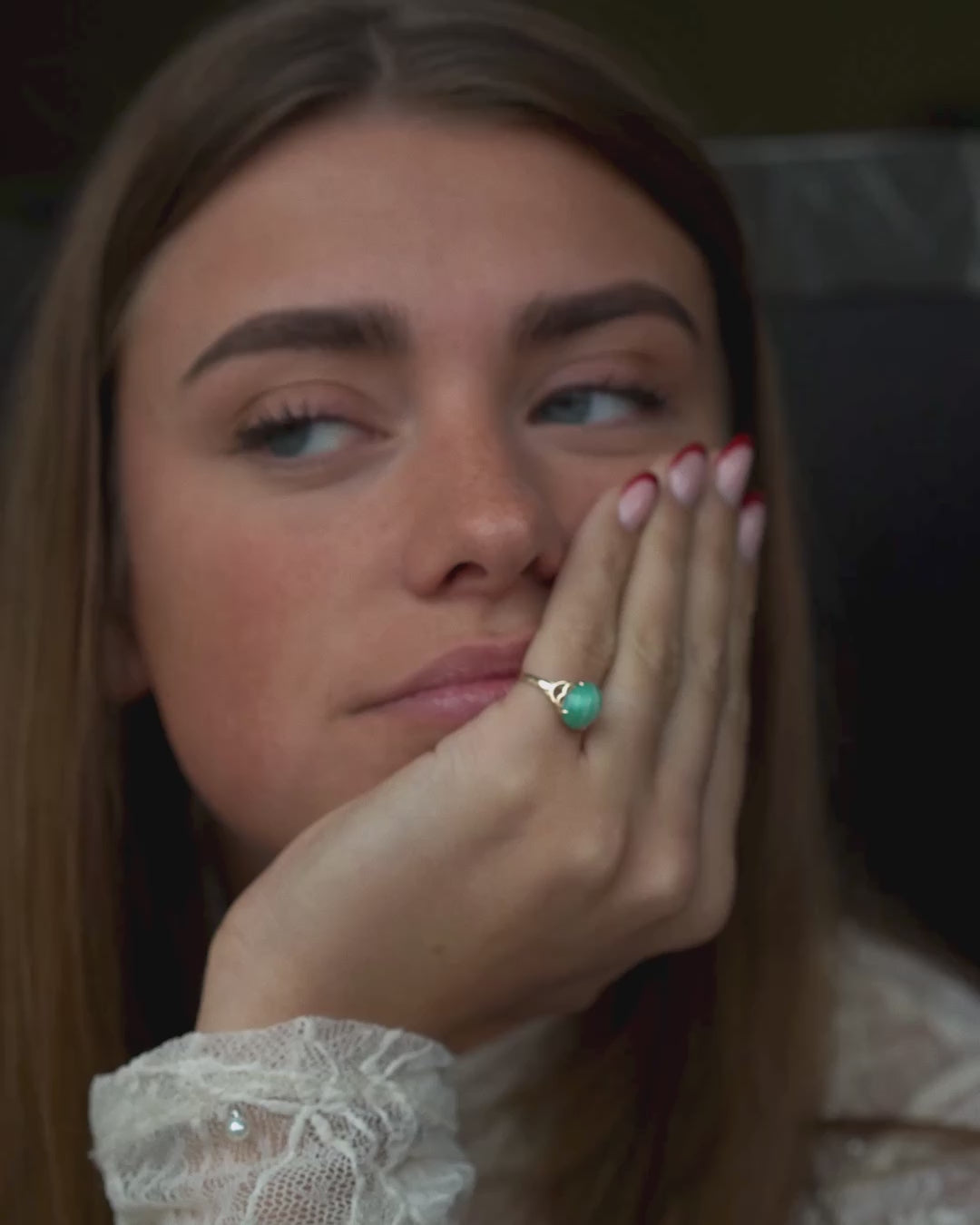 This vintage Dress Ring is set with a soft, turquoise-like agate that provides a playful and elegant color contrast. The 9k setting subtly frames the stone and beautifully highlights the unique color nuances of the agate.