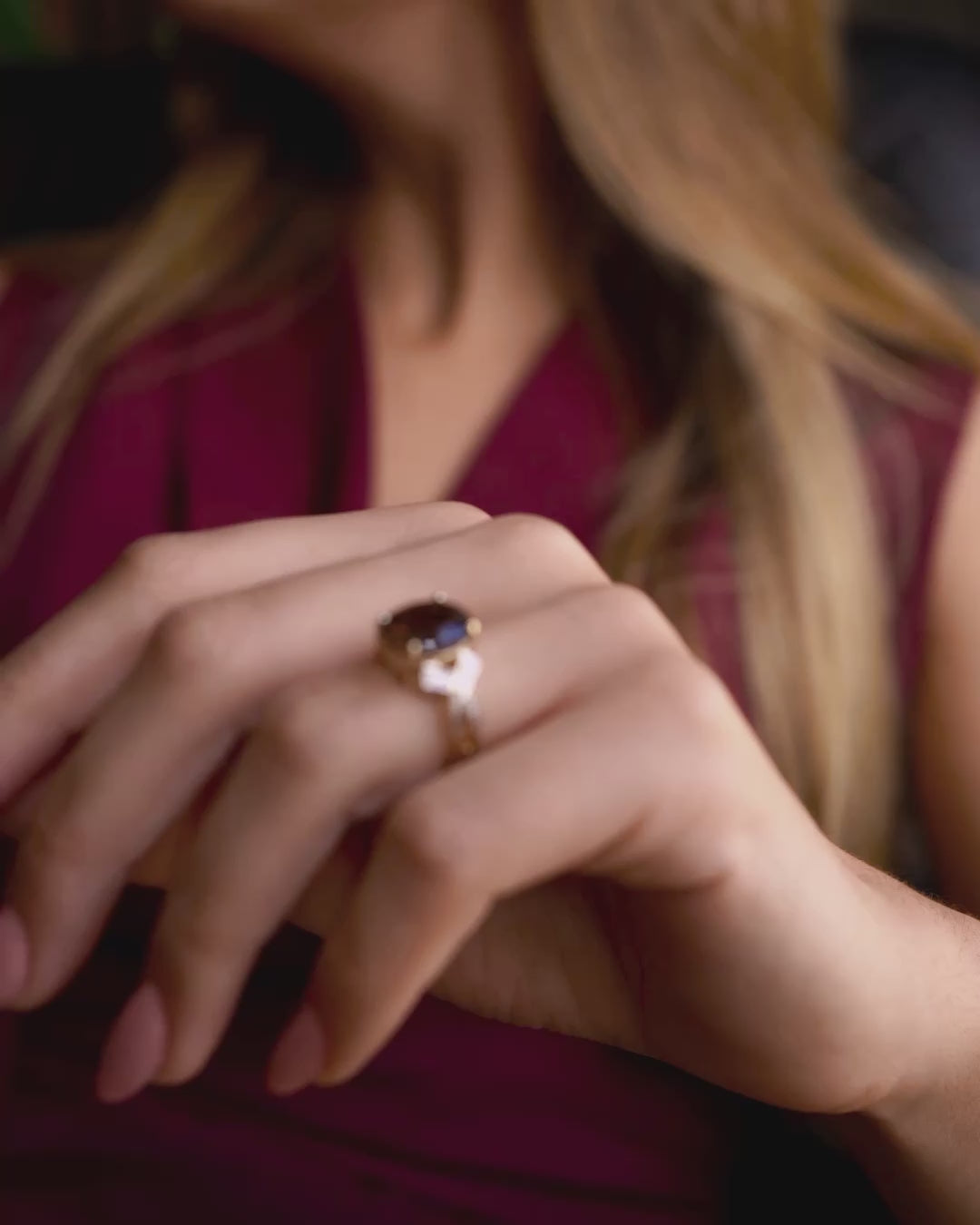 Claudette is an elegant vintage ring with a deep smoky quartz, whose warm, dark hue gives the piece a mysterious allure. Sparkling diamonds on the side add sophistication, while the oval design highlights the power of the central stone. A timeless piece that brings together class and mystique.