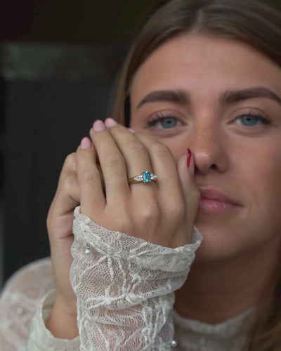 This vintage Solitaire Ring is set with a bright blue topaz that sparkles beautifully in the center, subtly accompanied by diamond accents. The 9k setting gives the ring a refined, timeless look and allows the color intensity of the topaz to shine through.