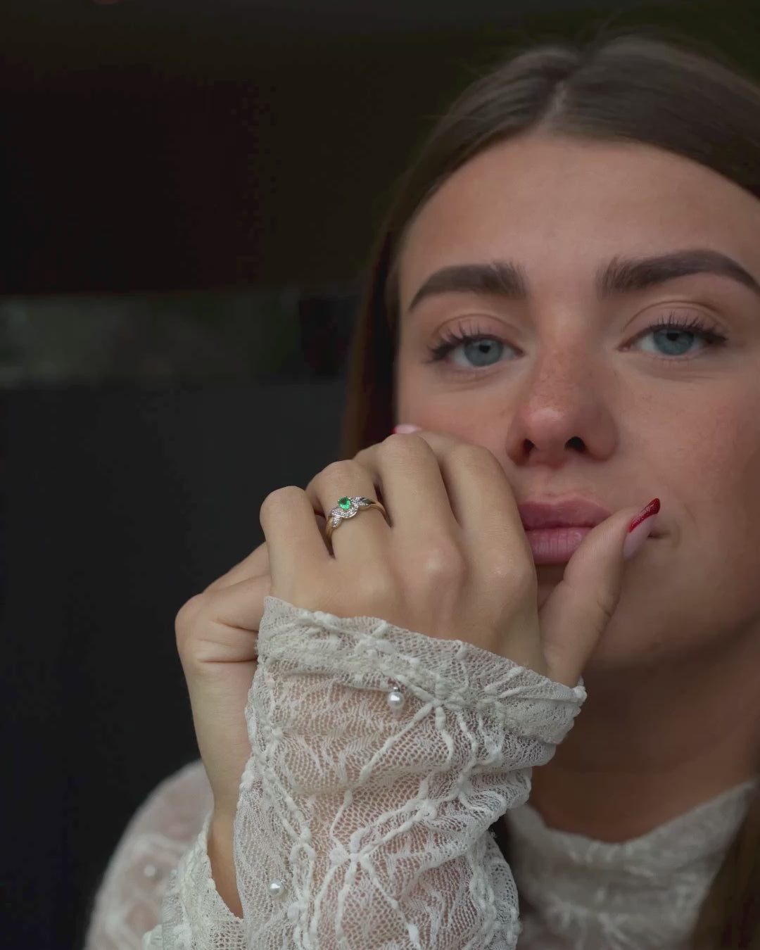 This vintage ring features a vibrant green emerald with subtle sparkling diamonds that beautifully enhance the depth and clarity of the stone. The 9k setting gives it an elegant, timeless look and allows the emerald to shine in all its glory.