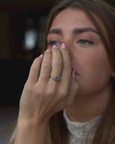 This vintage tanzanite and diamond solitaire ring features a vibrant violet tanzanite as its centerpiece, subtly framed by small diamonds that add extra sparkle. The 9k setting gives the ring a soft, elegant look and allows the color of the tanzanite to shine beautifully.