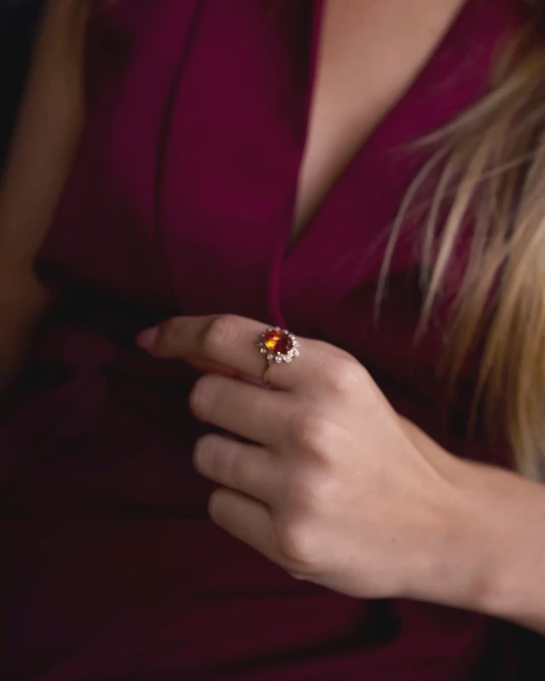 Margaux is a sophisticated vintage ring featuring a warm citrine surrounded by delicate pearls that enhance the softness of the stone. The floral design gives the ring a romantic feel, while the combination of glow and elegance makes the jewelry unique. A charming ring that exudes timeless class and femininity.