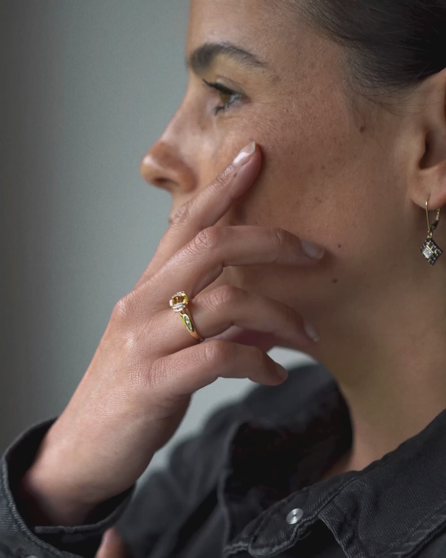 The Nerina ring exudes warmth and sophistication with its golden yellow citrine as its radiant centerpiece. The stone sparkles with a sunny glow and is subtly framed on either side by small diamonds that gracefully catch the light. The 9k setting enhances the citrine's vibrant color and gives the ring a classic, timeless elegance. A piece of jewelry that exudes strength and positivity. This special piece was hand-picked at one of the jewelers in Menina's global network, and has now arrived in Amsterdam, ready to start a new story with its future owner.