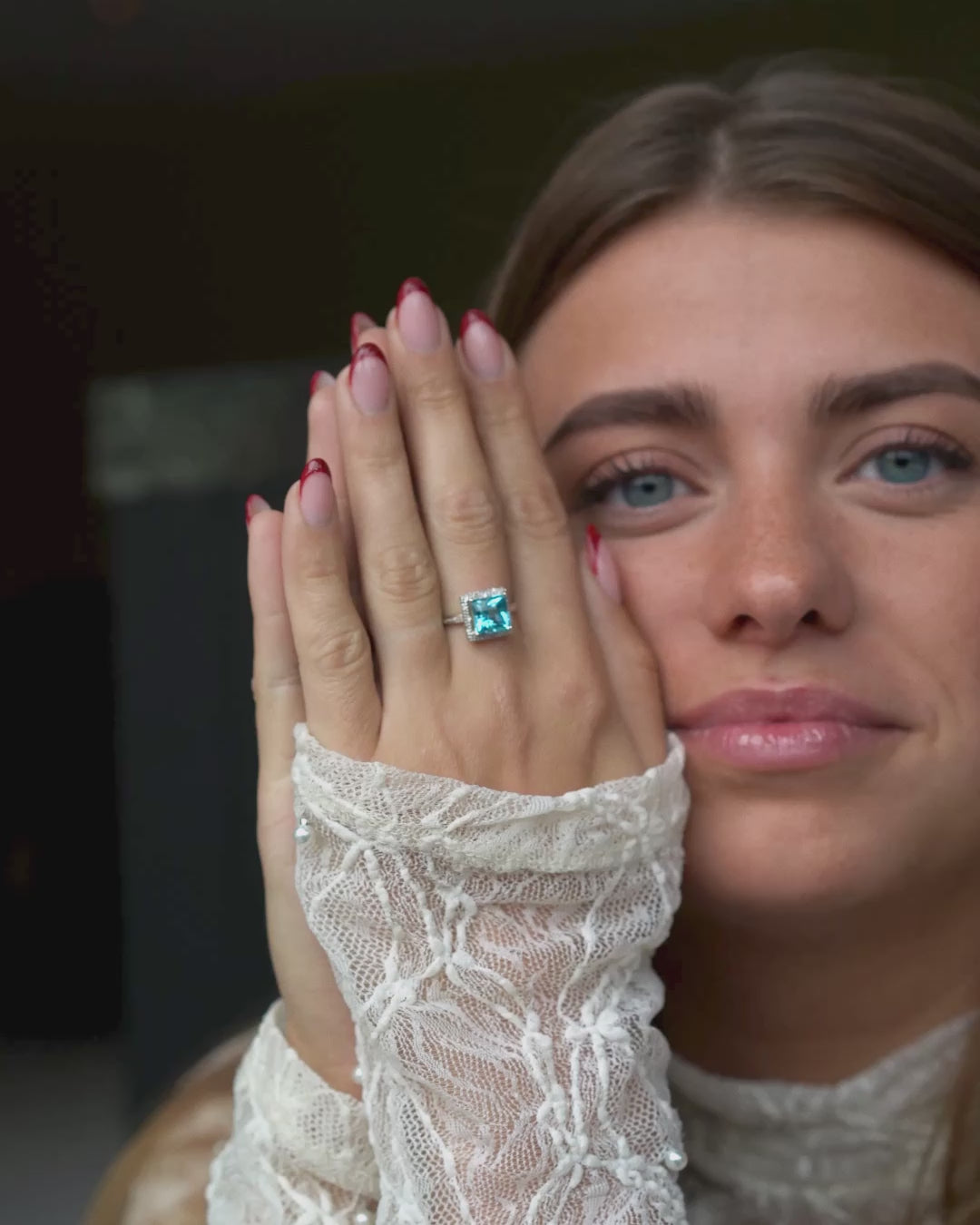 This Dress Ring features a bright blue topaz with diamonds that give the stone extra depth and light. The 9k setting keeps the whole piece sleek and modern, while the square cut creates a powerful, elegant look.