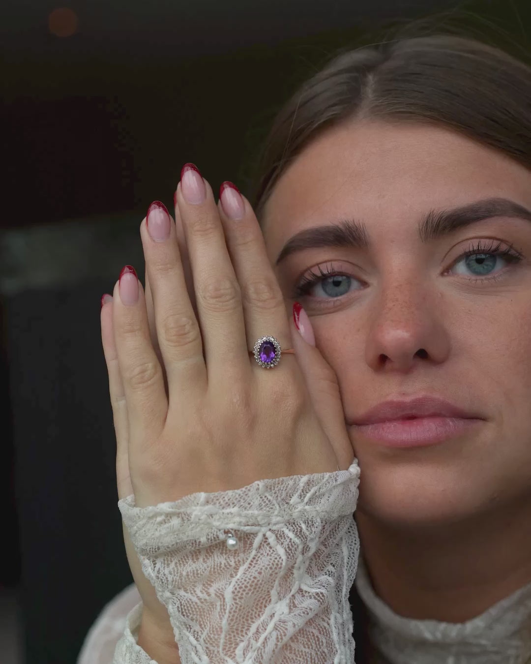 Yara is a refined Vintage Amethyst and Diamond Cluster Ring. Its elegant shape and deep purple color make it a timeless choice for everyday wear or a special occasion.