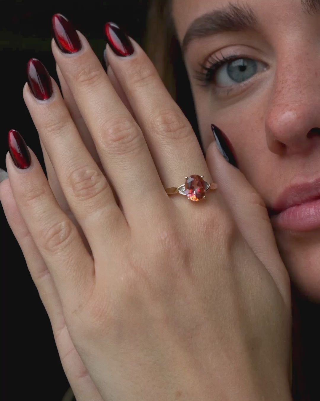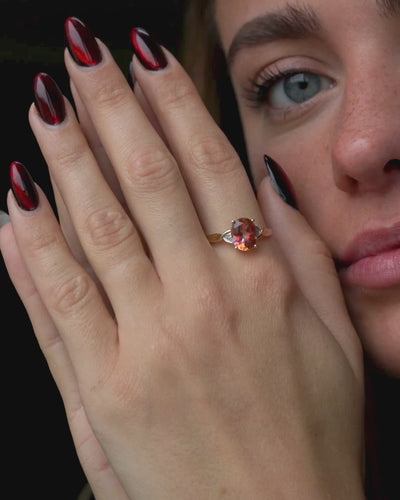 Deze vintage vuur topaas & diamant Three-Stone Ring heeft een warm en elegant ontwerp waarbij de vuur topaas centraal staat en wordt geflankeerd door diamanten. De Three-Stone Ring setting zorgt voor een uniek spel van kleur en schittering en geeft het sieraad een tijdloze, karaktervolle uitstraling.