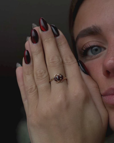 Deze vintage granaat Solitaire Ring heeft een klassiek en verfijnd ontwerp waarbij één granaat centraal staat. De Solitaire Ring setting legt alle nadruk op de diepe, warme kleur van de steen en geeft het sieraad een tijdloze en elegante uitstraling.