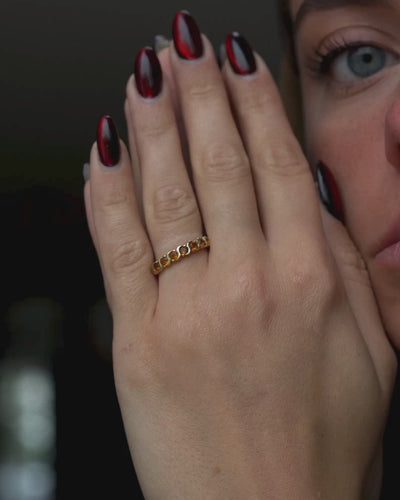 Deze vintage oranje saffier Dress Ring heeft een strak en elegant ontwerp waarbij meerdere oranje saffieren in een rechte lijn zitten. De Dress Ring setting geeft het sieraad een ingewikkelde, moderne uitstraling met een warm kleuraccent en een uitgesproken vintage karakter.