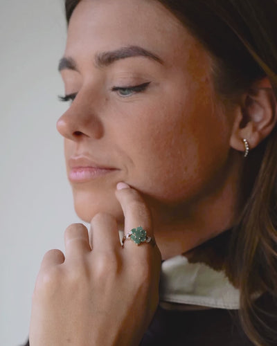Deze verfijnde vintage cluster ring is vervaardigd uit 9k en straalt met een levendige smaragd in het hart, omlijst door fonkelende diamanten die het groen extra laten oplichten. De harmonieuze combinatie van kleur en glans geeft dit stuk een tijdloze elegantie met een vleugje koninklijke allure. Met zorg geselecteerd bij een van onze juweliers uit Menina’s wereldwijde netwerk, is deze ring nu aangekomen in Amsterdam, klaar om een nieuw verhaal te beginnen met zijn toekomstige eigenares.