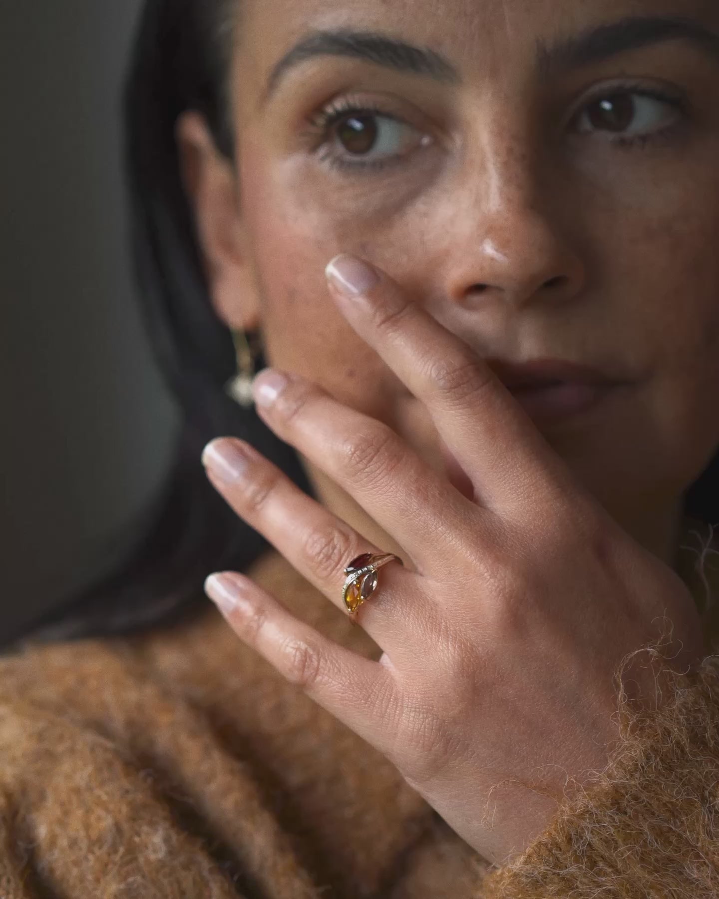 De Annelise ring is een levendige ode aan kleur en karakter. In dit unieke ontwerp schitteren meerdere edelstenen – waaronder warme tinten van citrien, granaat en rookkwarts – harmonieus naast sprankelende diamanten. Het 9k montuur brengt de kleuren tot leven en geeft de ring een speelse, luxueuze uitstraling. Een opvallend en artistiek sieraad dat perfect is voor wie houdt van individualiteit en verfijnde vintage charme. Dit bijzondere stuk werd met de hand uitgekozen bij een van de juweliers uit Menina’s wereldwijde netwerk, en is nu aangekomen in Amsterdam, klaar om een nieuw verhaal te beginnen met zijn toekomstige eigenares.