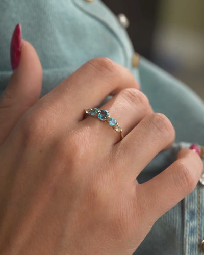 Deze verfijnde vintage ring is bezet met meerdere heldere topazen die samen een frisse, lichtblauwe schittering vormen. De stenen zijn gezet in 9 karaat en geven het ontwerp een elegante en tijdloze uitstraling met een subtiel sprankelend karakter. Dit bijzondere stuk is met zorg gevonden en met de hand geselecteerd via ons wereldwijde netwerk van juweliers. Na een prachtige reis naar Amsterdam is deze ring nu klaar om een nieuw verhaal te beginnen.