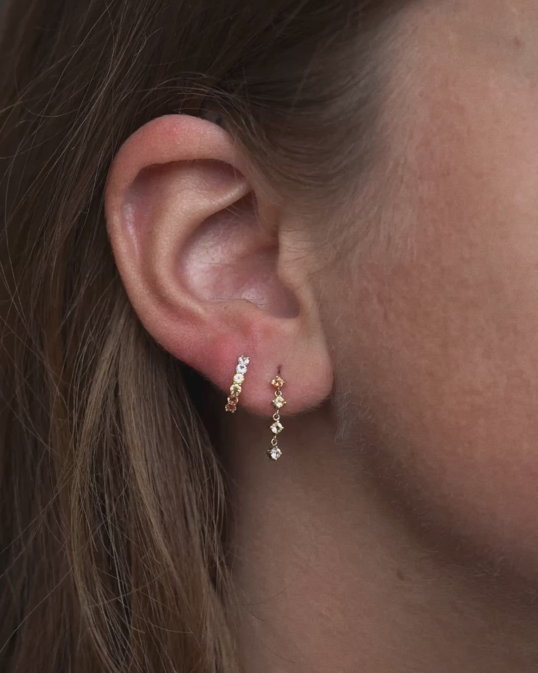 Elegante huggie-oorbellen met een warme, zonnige gloed. Gemaakt van 14-karaats geel goud en bezet met witte saffieren, oranje saffieren en gele kristallen die samen een subtiel kleurverloop vormen van licht naar diepgoud. De ronde vorm sluit mooi om het oor en geeft de oorbellen een verfijnde, luxueuze uitstraling. Perfect voor dagelijks gebruik, maar ook elegant genoeg voor een avondlook.