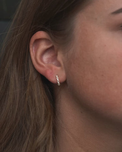 Elegante huggie-oorbellen met een doorlopende rij witte saffieren die zacht fonkelen bij elke beweging. Gemaakt van 14-karaats geel goud en bezet met stenen in verschillende groottes voor een subtiel en verfijnd spel van licht. De compacte, ronde vorm sluit mooi om het oor en straalt tijdloze elegantie uit. Een veelzijdig paar dat moeiteloos combineert met andere oorbellen of solo gedragen kan worden voor een verfijnde, moderne look.
