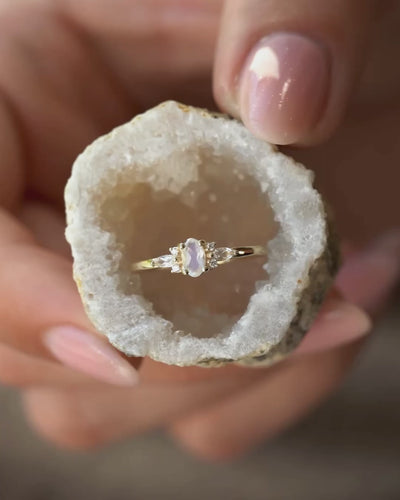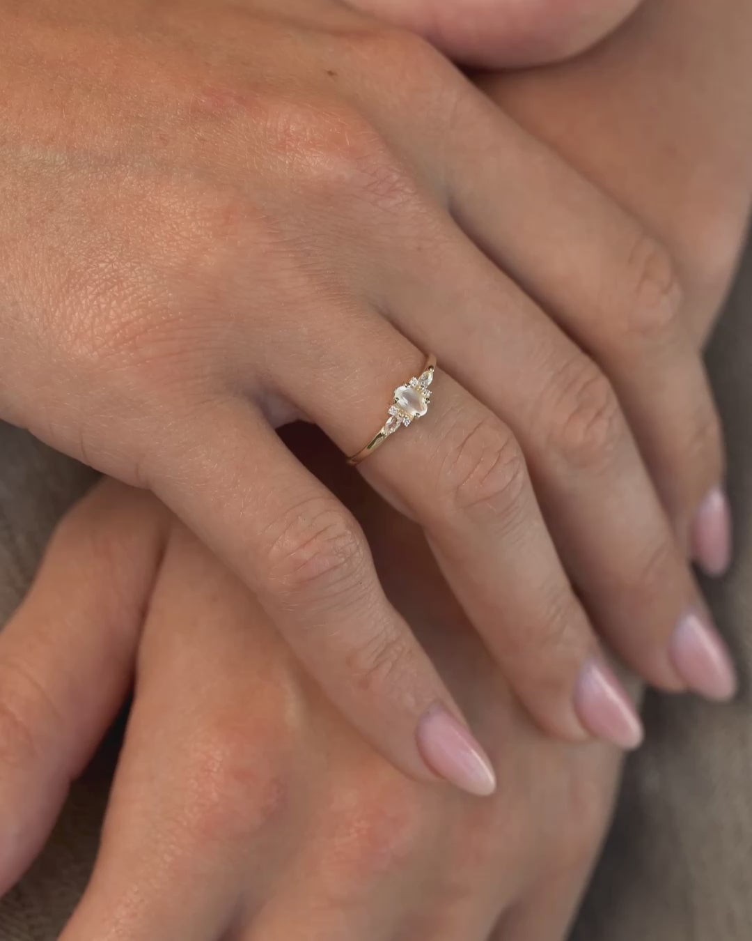 De Camille ring heeft een verfijnde en bijna dromerige uitstraling die direct rust en zachtheid uitstraalt. De ovale maansteen vormt het stralende middelpunt en vangt het licht op een subtiele, mysterieuze manier, terwijl de slanke diamanten accenten zorgen voor een fijne schittering en balans in het ontwerp. De combinatie van vormen geeft de ring een elegante en vrouwelijke uitstraling die licht aanvoelt en moeiteloos te dragen is. Een tijdloos stuk met een zachte, bijzondere uitstraling dat elke look verfijnt.