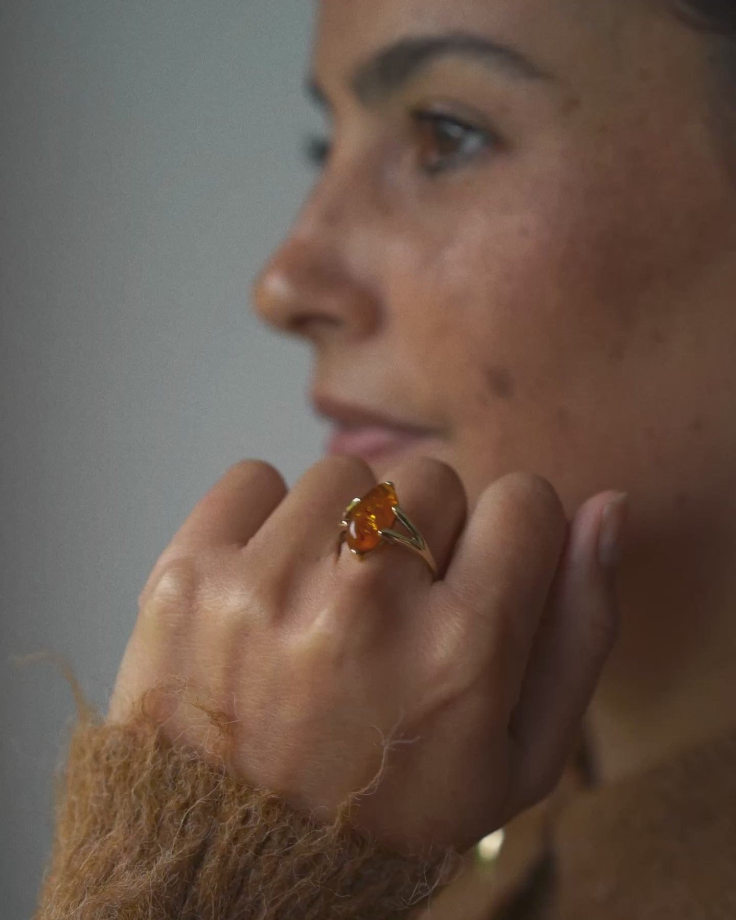 De Camille ring vangt de warmte van de zon in haar hart met een schitterende barnsteen van honingkleurige gloed. De langwerpige, marquise geslepen steen onthult een fascinerend spel van licht en diepte, prachtig omlijst door het zachte 9k montuur. Deze solitaire ring straalt natuurlijke elegantie en rust uit, perfect voor wie houdt van de organische schoonheid van vintage sieraden. Dit bijzondere stuk werd met de hand uitgekozen bij een van de juweliers uit Menina’s wereldwijde netwerk, en is nu aangekomen in Amsterdam, klaar om een nieuw verhaal te beginnen met zijn toekomstige eigenares.