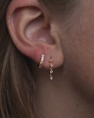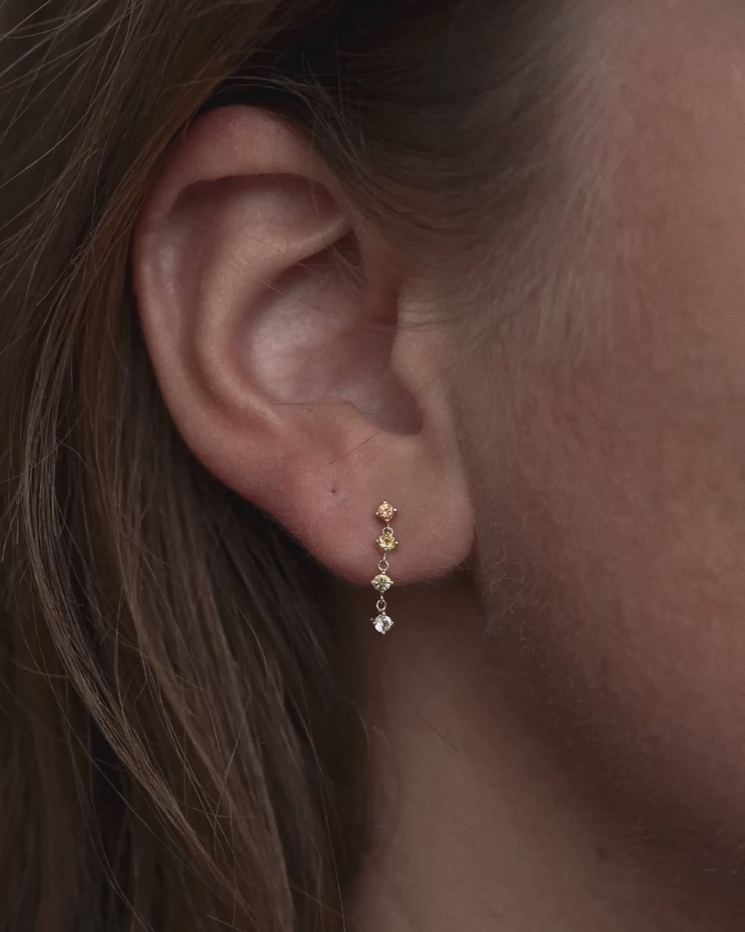 Een paar verfijnde drop-earrings met een warme, stralende gloed. Gemaakt van 14-karaats geel goud en bezet met oranje saffier, donkergele en lichtgele kristallen en witte saffieren, die samen een geleidelijke overgang vormen van diepe warmte naar helder licht. De sierlijke verticale lijn van stenen beweegt subtiel mee bij elke beweging en zorgt voor een elegante, luxueuze uitstraling. Een tijdloos ontwerp dat moeiteloos gedragen kan worden van dag tot avond.