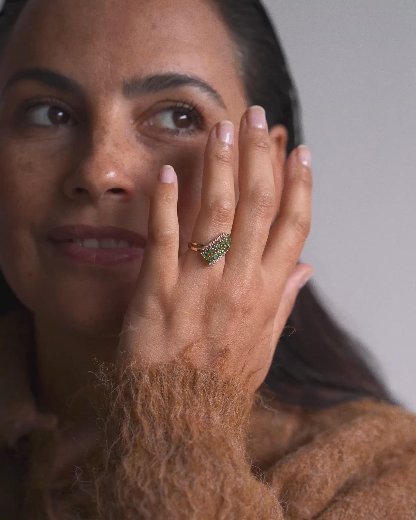 De Claudine ring straalt levendige elegantie uit met haar sprankelende tsavoriet granaten, die fonkelen in een rijk palet van smaragdgroene tinten. Fijngezette diamanten omlijsten de groene gloed en voegen een vleugje schittering toe, terwijl het 9k montuur zorgt voor een harmonieuze, verfijnde afwerking. Deze prachtige cluster ring is een ode aan klassieke glamour met een frisse, eigentijdse uitstraling. Dit bijzondere stuk werd met de hand uitgekozen bij een van de juweliers uit Menina’s wereldwijde netwerk, en is nu aangekomen in Amsterdam, klaar om een nieuw verhaal te beginnen met zijn toekomstige eigenares.