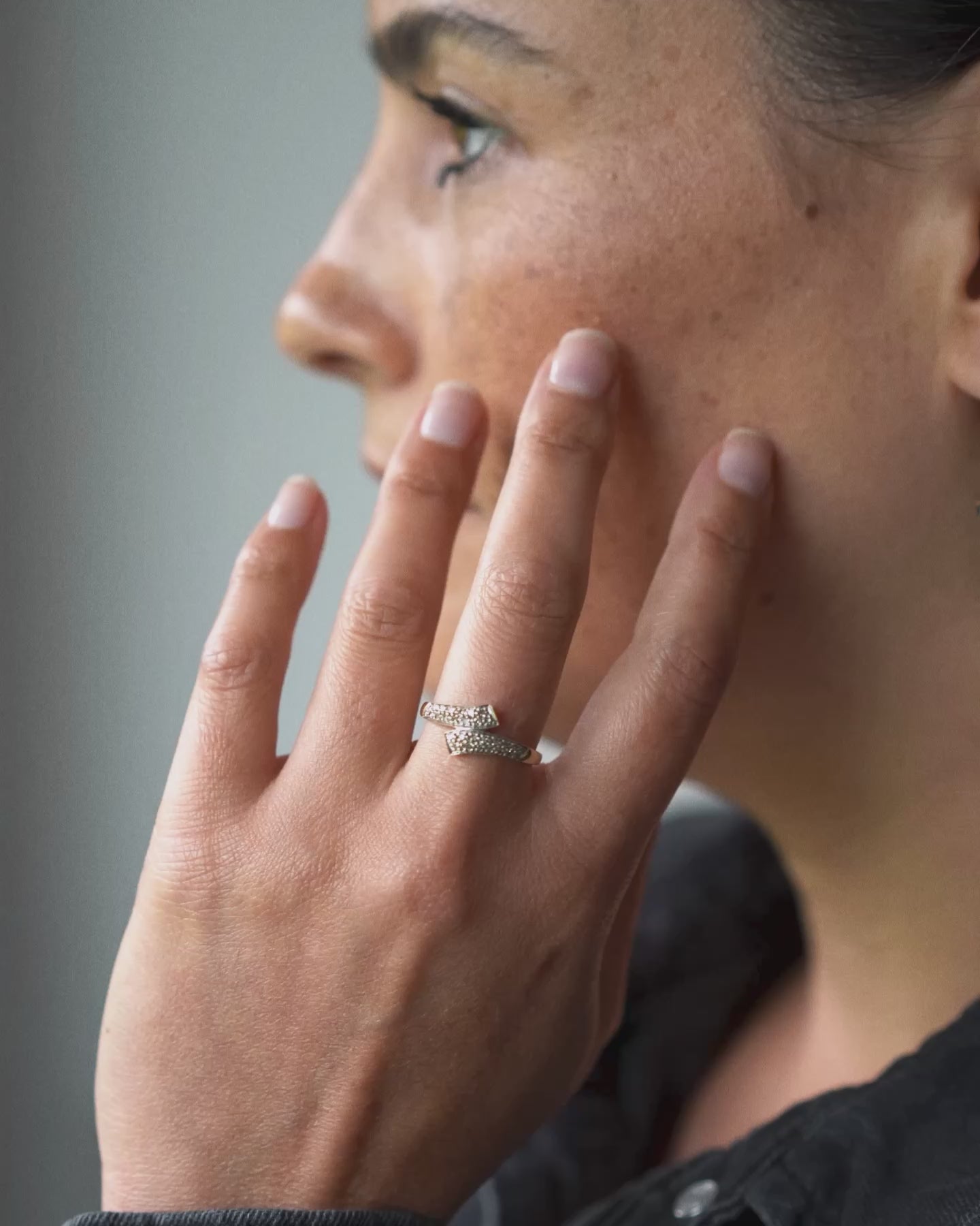 De Delara ring is een schitterend samenspel van licht en elegantie. Een verfijnde verzameling diamanten vormt een fonkelende cluster die het licht vanuit elke hoek vangt. Het 9k montuur heeft een subtiel golvend ontwerp dat de stenen extra diepte en glans geeft, waardoor deze ring een moderne draai krijgt aan klassieke vintage luxe. Perfect voor wie houdt van ingetogen schittering met een tijdloze uitstraling. Dit bijzondere stuk werd met de hand uitgekozen bij een van de juweliers uit Menina’s wereldwijde netwerk, en is nu aangekomen in Amsterdam, klaar om een nieuw verhaal te beginnen met zijn toekomstige eigenares.