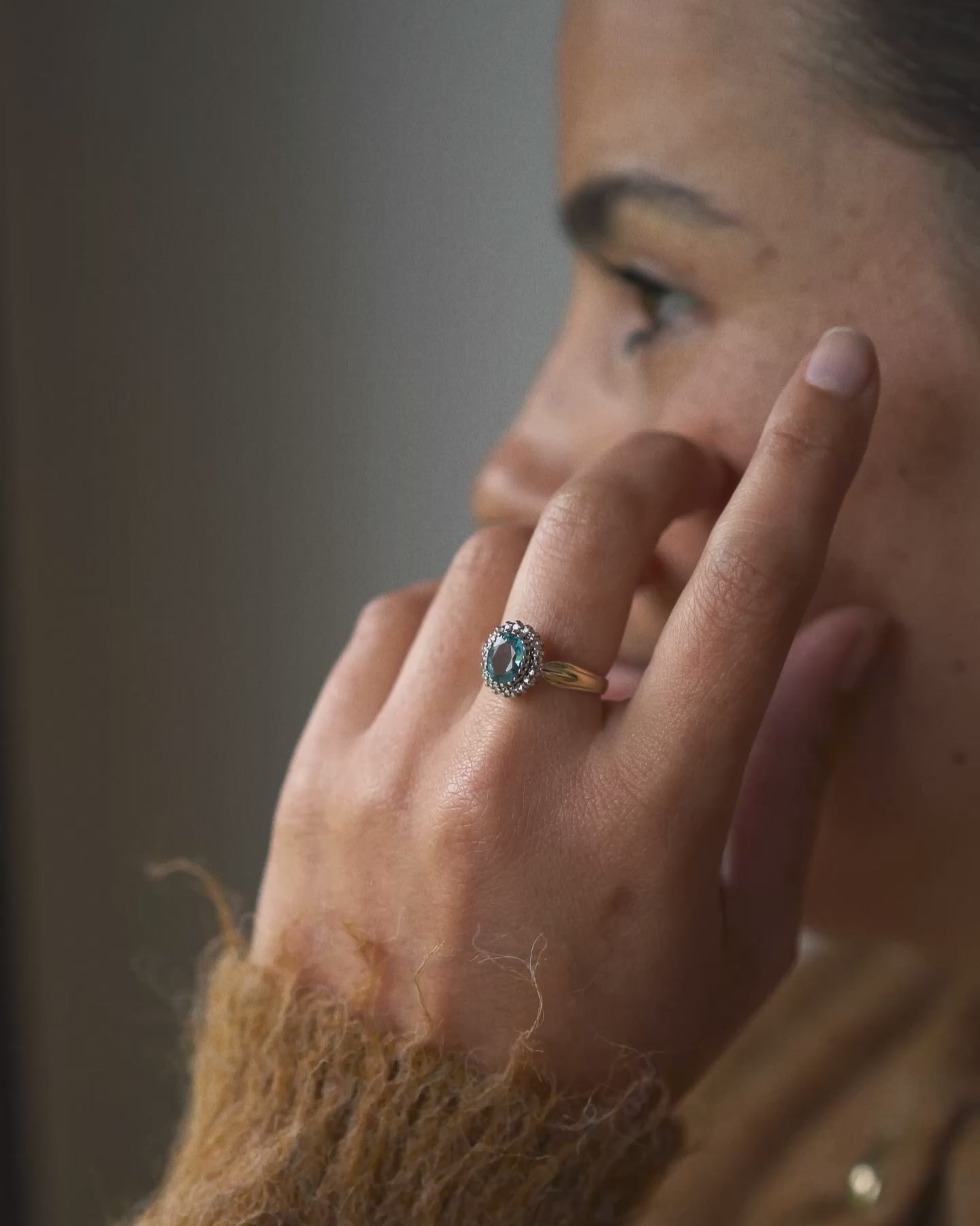 De Elaria ring straalt pure elegantie uit met haar betoverende blauwe topaas, omringd door een fonkelende halo van diamanten. De ovale steen vangt het licht op een manier die doet denken aan een kalme oceaan, terwijl de diamanten rondom zorgen voor een subtiel sprankelend kader. Het 9k montuur versterkt het tijdloze karakter van dit verfijnde ontwerp, dat moeiteloos charme en klasse combineert. Dit bijzondere stuk werd met de hand uitgekozen bij een van de juweliers uit Menina’s wereldwijde netwerk, en is nu aangekomen in Amsterdam, klaar om een nieuw verhaal te beginnen met zijn toekomstige eigenares.