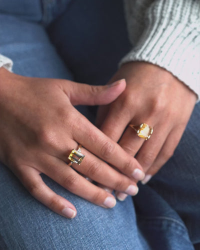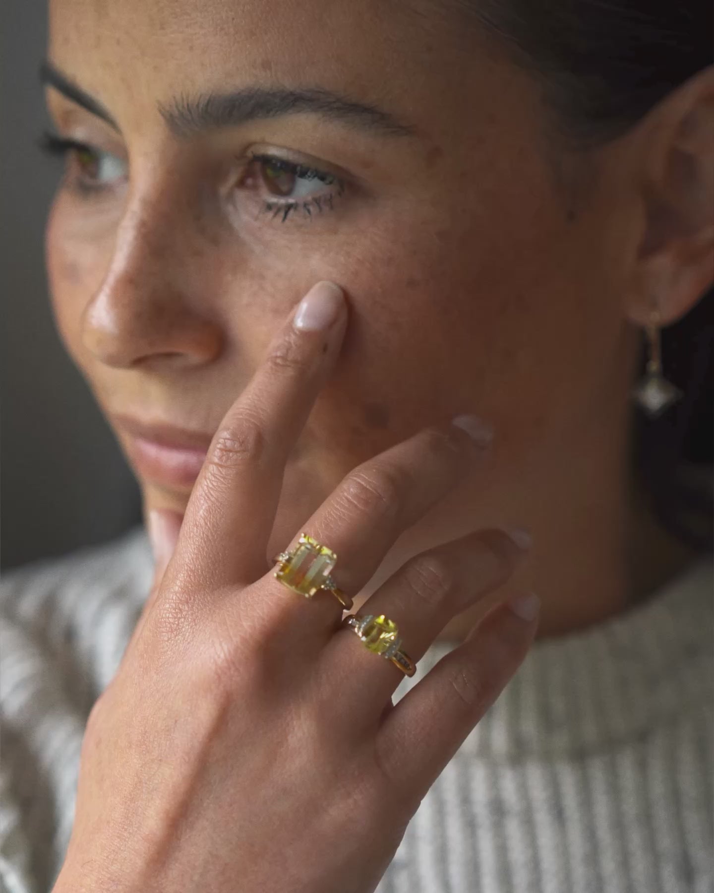 De Elira ring is een waar kunstwerk van kleur en licht. In het midden schittert een rechthoekig geslepen bi-colour kwarts, waarin warme honingtonen subtiel overvloeien in zachte champagnekleurige schakeringen. Aan weerszijden fonkelen delicate witte saffieren die het sprankelende karakter van de centrale steen versterken. Het 9k montuur omlijst de edelsteen met verfijnde elegantie, waardoor dit stuk een perfecte balans vindt tussen modern design en vintage allure. Dit bijzondere sieraad werd met de hand uitgekozen bij een van de juweliers uit Menina’s wereldwijde netwerk, en is nu aangekomen in Amsterdam, klaar om een nieuw verhaal te beginnen met zijn toekomstige eigenares.
