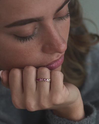 Een verfijnde half-eternity ring met een zacht kleurverloop van roze tot wit. Gemaakt van 14-karaats geel goud en bezet met toermalijn, donkerroze en lichtroze saffieren en witte saffieren die samen een romantische schittering creëren. De ovaalgeslepen stenen vormen een elegante lijn over de ring en geven haar een moderne, vrouwelijke uitstraling. Een tijdloos ontwerp dat subtiel opvalt en prachtig combineert met andere ringen.