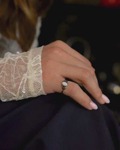 De Elyora ring is een gracieuze vintage creatie, gezet met een iriserende witte opaal die haar gloed subtiel weerspiegelt in twee diepblauwe saffieren aan weerszijden. De combinatie van de zachte, melkachtige schittering van de opaal met het koele fluweel van de saffieren creëert een verfijnd contrast dat rust en allure uitstraalt. Met haar sierlijke vorm en klassieke balans belichaamt Elyora de charme van een vervlogen tijd, zorgvuldig behouden en klaar om opnieuw gedragen te worden als symbool van tijdloze elegantie.
