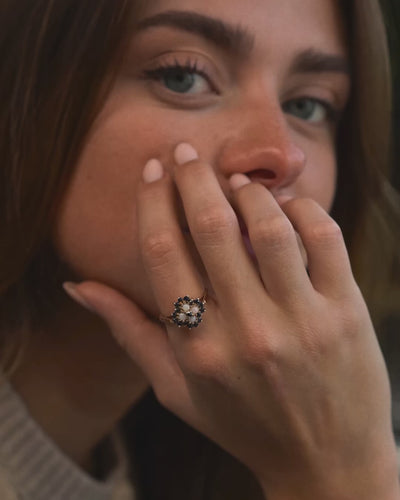 Emma ademt de magie van contrast en licht. In het hart schittert een melkachtig witte opaal, omringd door een cirkel van diepblauwe saffieren die haar iriserende gloed nog intenser doen stralen. De 9 karaat zetting versterkt haar klassieke bloemvorm, waardoor deze ring een tijdloze charme en zachte romantiek uitstraalt – een ode aan vrouwelijkheid en verfijning.