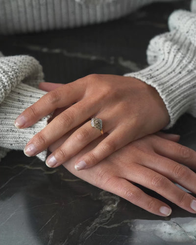De Evelina ring straalt pure elegantie uit met haar schitterende cluster van diamanten die samen een verbluffend lichtspel creëren. De stenen zijn zorgvuldig gezet in een verfijnd 9k montuur dat de klassieke charme van het ontwerp benadrukt. Deze ring vangt de perfecte balans tussen tijdloze glamour en subtiele luxe, ideaal voor wie houdt van een sprankelende, maar verfijnde stijl. Dit bijzondere stuk werd met de hand uitgekozen bij een van de juweliers uit Menina’s wereldwijde netwerk, en is nu aangekomen in Amsterdam, klaar om een nieuw verhaal te beginnen met zijn toekomstige eigenares.