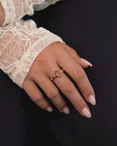 Deze verfijnde vintage driesteen ring is vervaardigd uit 9k en schittert met een vurige oranje opaal, omlijst door twee heldere diamanten die het warme licht van de steen prachtig versterken. De bijzondere kleurschakering en klassieke vormgeving geven dit stuk een luxueuze, doch subtiele uitstraling. Met de hand geselecteerd bij een van onze juweliers uit Menina’s wereldwijde netwerk, is deze ring nu in Amsterdam aangekomen, klaar om een nieuw verhaal te beginnen met zijn toekomstige eigenares.