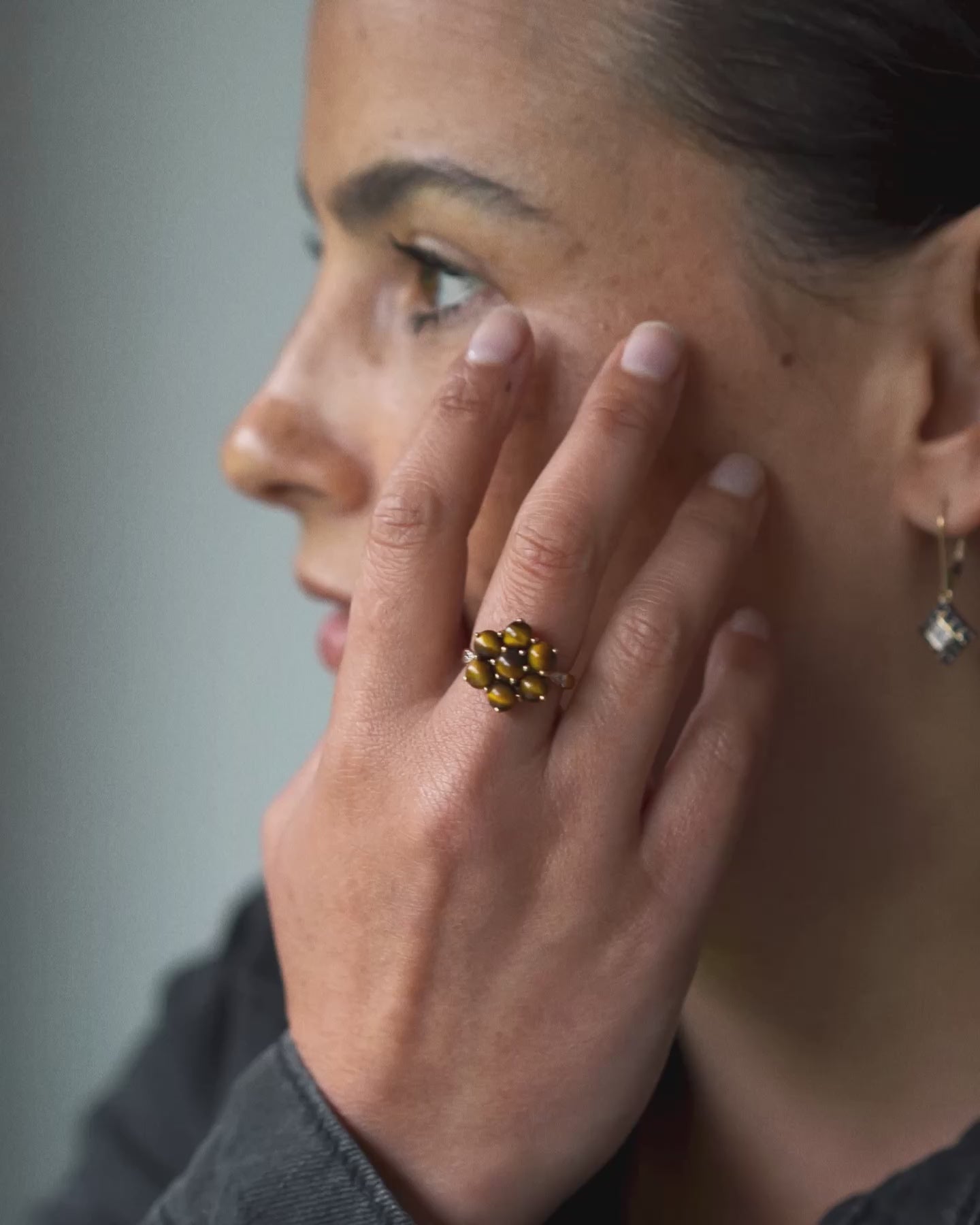 De Irene ring is een betoverende vintage cluster ring waarin de warme gloed van tijgeroog schitterend samensmelt met de subtiele fonkeling van diamanten. De natuurlijke, honingbruine tinten van de tijgeroogstenen worden prachtig versterkt door het zachte glansspel van het 9k montuur, wat de ring een elegante en krachtige uitstraling geeft. Dit bijzondere stuk werd met de hand uitgekozen bij een van de juweliers uit Menina’s wereldwijde netwerk, en is nu aangekomen in Amsterdam, klaar om een nieuw verhaal te beginnen met zijn toekomstige eigenares.
