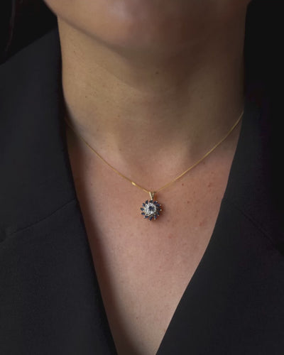 Deze elegante vintage hanger is vervaardigd uit 9k en schittert met een diepblauwe saffier, omringd door fonkelende diamanten in een klassiek bloemvormig design. Het stuk ademt verfijning en tijdloze allure — perfect om elke outfit naar een hoger niveau te tillen. Deze hanger werd met zorg met de hand uitgekozen bij een van onze juweliers uit Menina’s wereldwijde netwerk en is nu aangekomen in Amsterdam, klaar om een nieuw verhaal te beginnen met zijn toekomstige eigenares.