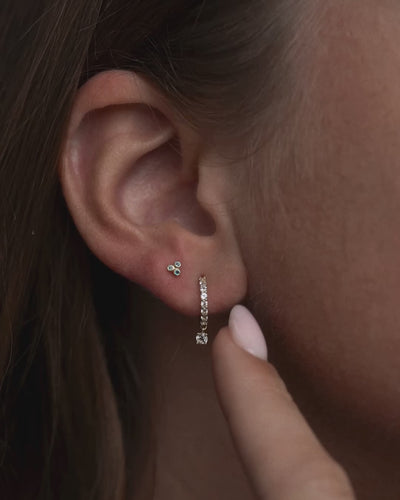 Verfijnde huggie-oorbellen met een sprankelende afwerking. Gemaakt van 14-karaats geel goud en volledig bezet met kleine topazen, afgewerkt met een grotere hangersteen die subtiel beweegt bij elke stap. De combinatie van de pavé-zetting en de losse steen zorgt voor een elegante balans tussen verfijning en speelsheid. Een moderne klassieker die moeiteloos schittering toevoegt aan elke look.