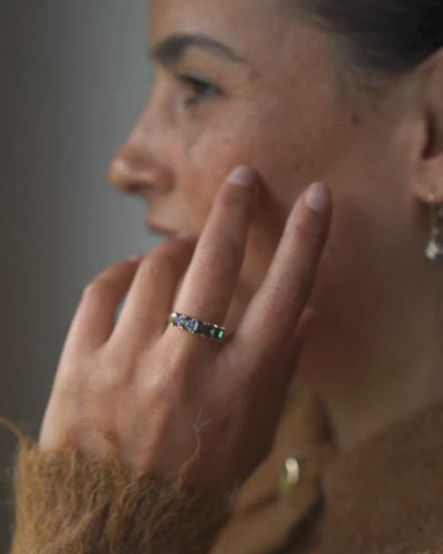 De Lucienne ring is een betoverend spel van kleur en licht. Vijf mystic topazen tonen een iriserend spectrum van groen, paars en blauw, dat verandert met elke beweging van de hand. Het 9k montuur omlijst de stenen op verfijnde wijze en versterkt hun magische gloed. Deze vijfsteenring is een moderne interpretatie van klassieke elegantie, met een vleugje mystiek die haar uniek maakt. Dit bijzondere stuk werd met de hand uitgekozen bij een van de juweliers uit Menina’s wereldwijde netwerk, en is nu aangekomen in Amsterdam, klaar om een nieuw verhaal te beginnen met zijn toekomstige eigenares.