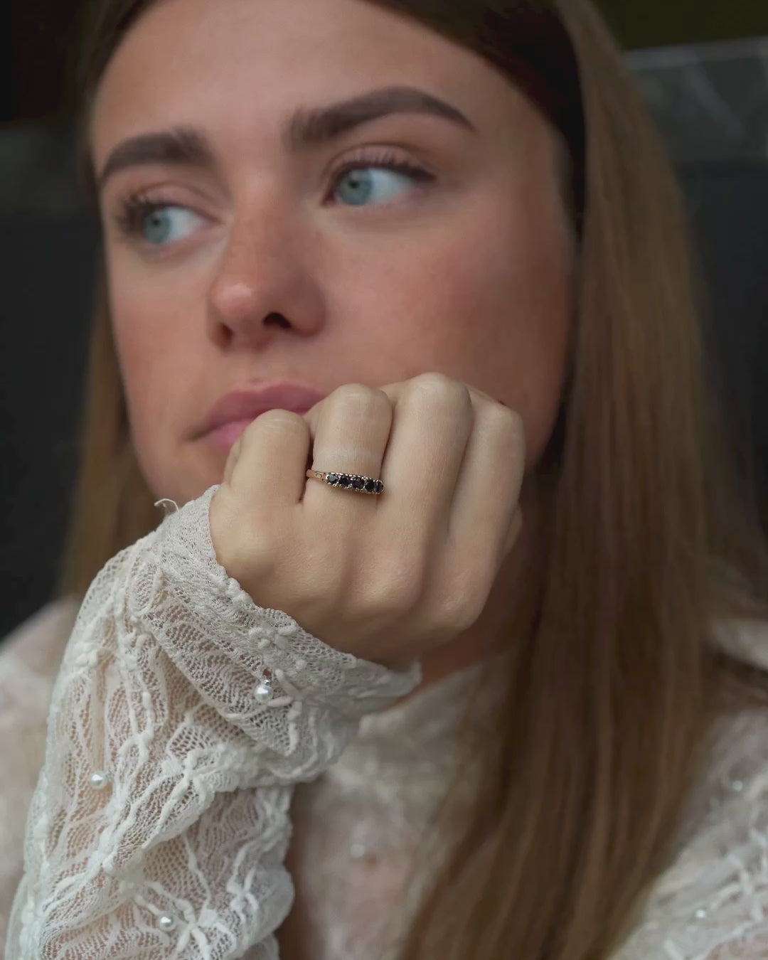 Deze vintage Dress Ring is gezet met een rij diepblauwe saffieren die samen een elegant en tijdloos silhouet vormen. De 9k setting benadrukt de verfijnde lijn van stenen en laat de rijke kleur van de saffieren prachtig spreken.