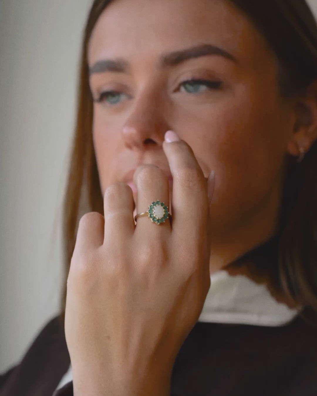 De Melura ring is een opvallende vintage creatie, met in het hart een zachte witte opaal die subtiel oplicht in iriserende tinten. Rondom haar fonkelen levendige groene agaten in een ovale omlijsting, waardoor een harmonieus spel van kleur en licht ontstaat. De combinatie van het zachte binnenlicht van de opaal en het frisse groen van de agaten geeft deze ring een uitgesproken maar verfijnde uitstraling. Een uniek stuk dat doet denken aan oude Engelse tuinen — vol karakter, elegantie en natuurlijke schoonheid.