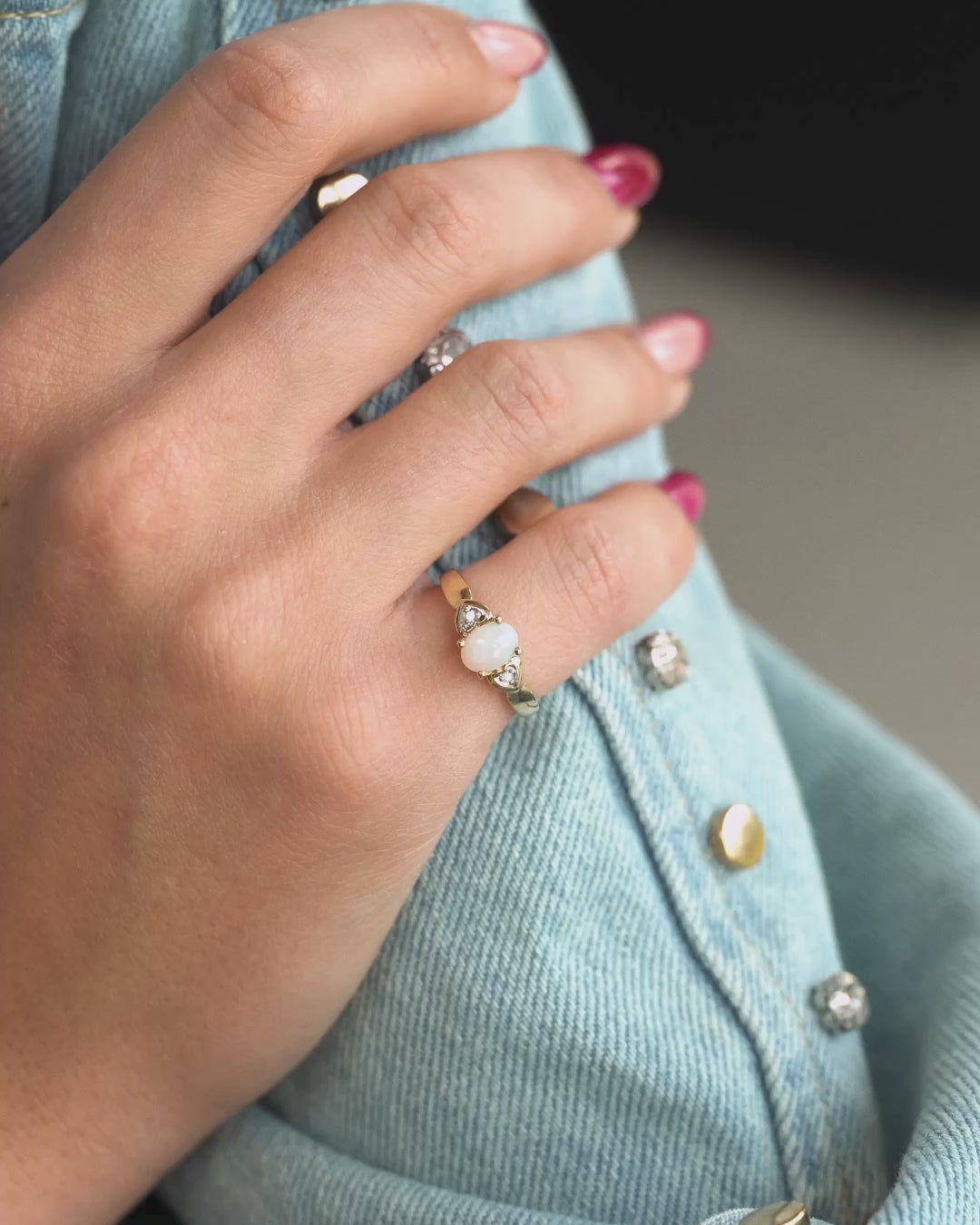 Deze verfijnde vintage ring combineert de betoverende kleurschakeringen van opaal met de subtiele schittering van diamant, wat zorgt voor een speels en elegant geheel. De stenen zijn gezet in 9 karaat en geven het ontwerp een romantische en tijdloze uitstraling met een zachte, vrouwelijke charme. Dit bijzondere stuk is met zorg gevonden en met de hand geselecteerd via ons wereldwijde netwerk van juweliers. Na een prachtige reis naar Amsterdam is deze ring nu klaar om een nieuw verhaal te beginnen.