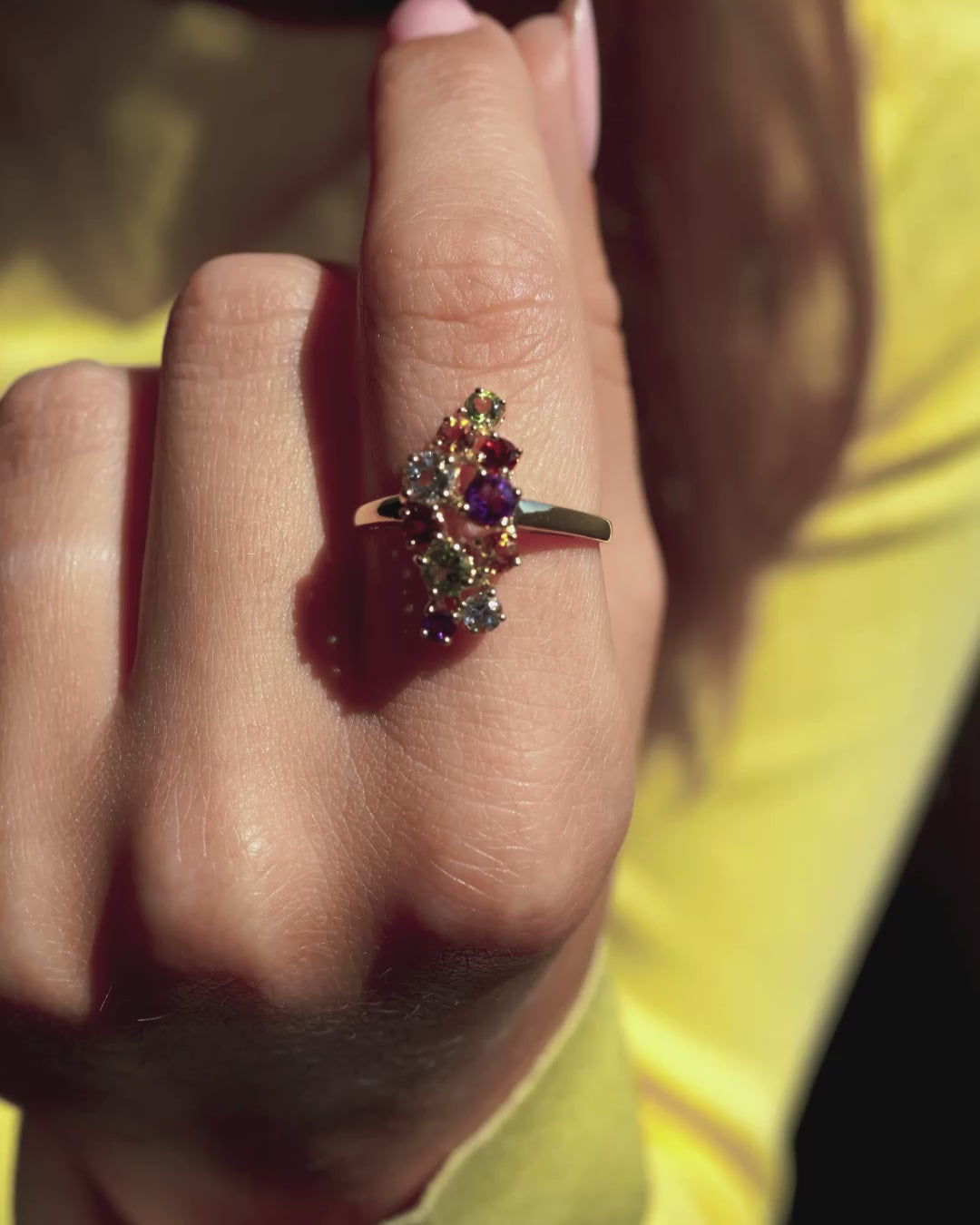 De Thalie ring is een speels en kleurrijk 9 karaat sieraad met amethist, topaas, citrien en granaat, samengebracht in een bloemachtige cluster. Een opvallend en karaktervol ontwerp, perfect voor liefhebbers van kleur en een vleugje retro.