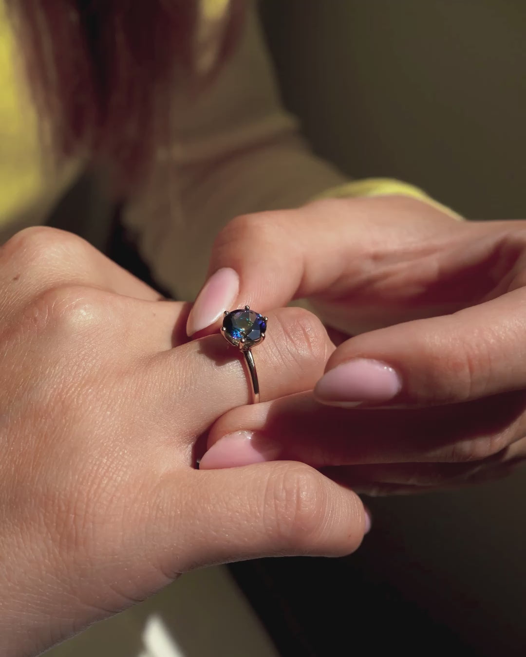 De Nélya ring is een 9 karaat sieraad met een mystic topaas die het licht vangt en kleur verandert van blauw naar paars en groen. De eenvoudige zetting en gladde band laten de steen volledig schitteren. Een mysterieus en modern sieraad.