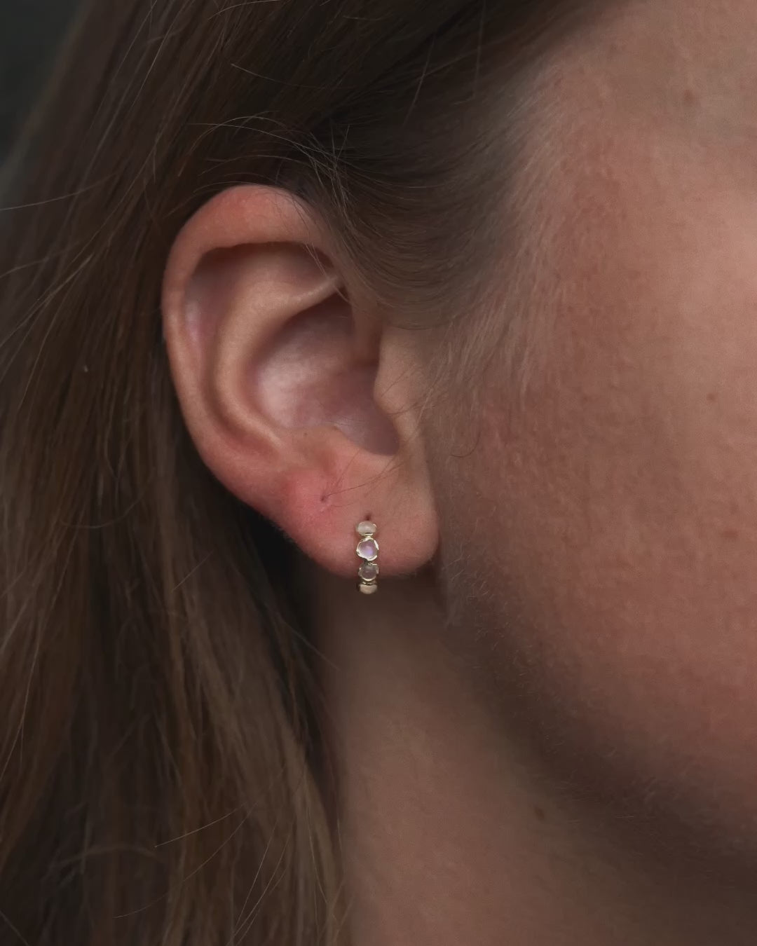 Elegante huggiea met een zachte, parelachtige glans. Gemaakt van 14-karaats geel goud en bezet met ronde maanstenen die subtiel licht vangen en een dromerige uitstraling geven. De compacte, ronde vorm sluit mooi om het oor en zorgt voor een verfijnde balans tussen modern design en tijdloze elegantie. Een veelzijdig paar dat moeiteloos past bij elke look.