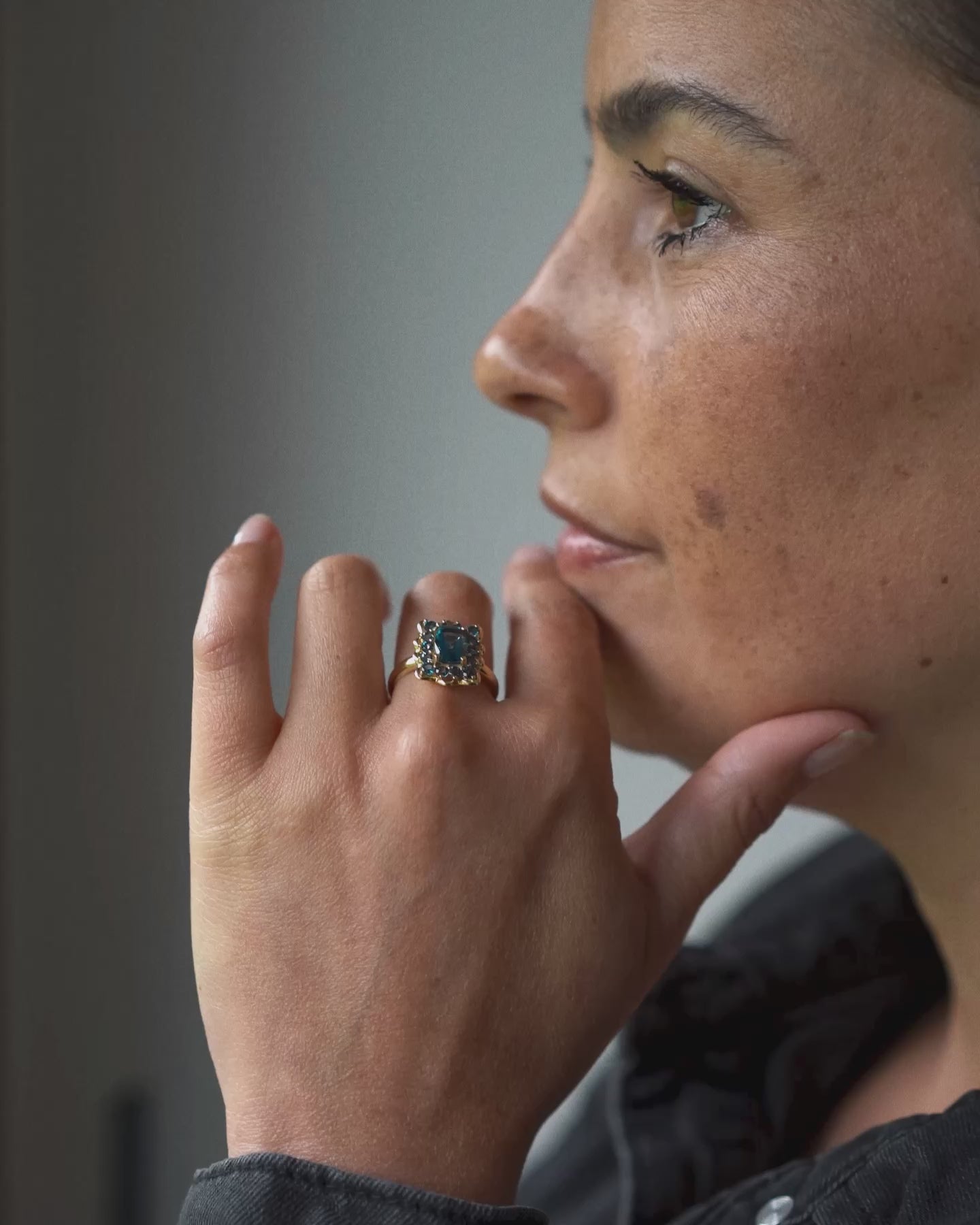 De Odessaine ring straalt tijdloze elegantie uit met haar fonkelende blauwe topazen, zorgvuldig gerangschikt in een verfijnde cluster. De centrale steen schittert met een diepe, oceaanblauwe glans, omlijst door kleinere topazen die het licht op betoverende wijze weerkaatsen. Het 9k montuur geeft de ring een klassieke en luxueuze uitstraling, perfect voor wie houdt van verfijnde vintage schoonheid met een vleugje grandeur. Dit bijzondere stuk werd met de hand uitgekozen bij een van de juweliers uit Menina’s wereldwijde netwerk, en is nu aangekomen in Amsterdam, klaar om een nieuw verhaal te beginnen met zijn toekomstige eigenares.