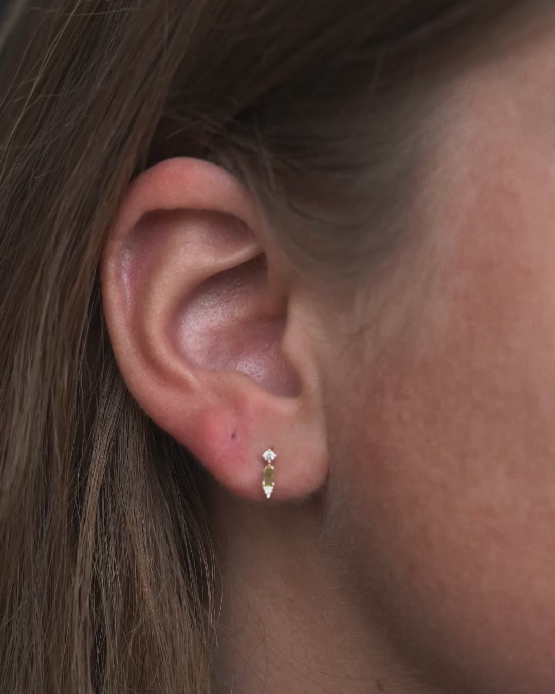 Verfijnde drop studs met een zachte, natuurlijke schittering. Gemaakt van 14-karaats geel goud en bezet met baguette-geslepen olivijn, gecombineerd met ronde witte saffieren die het licht elegant vangen. De verticale compositie en subtiele beweging geven de oorbellen een moderne, vrouwelijke uitstraling. Een elegant paar dat moeiteloos kleur en verfijning toevoegt aan elke look.