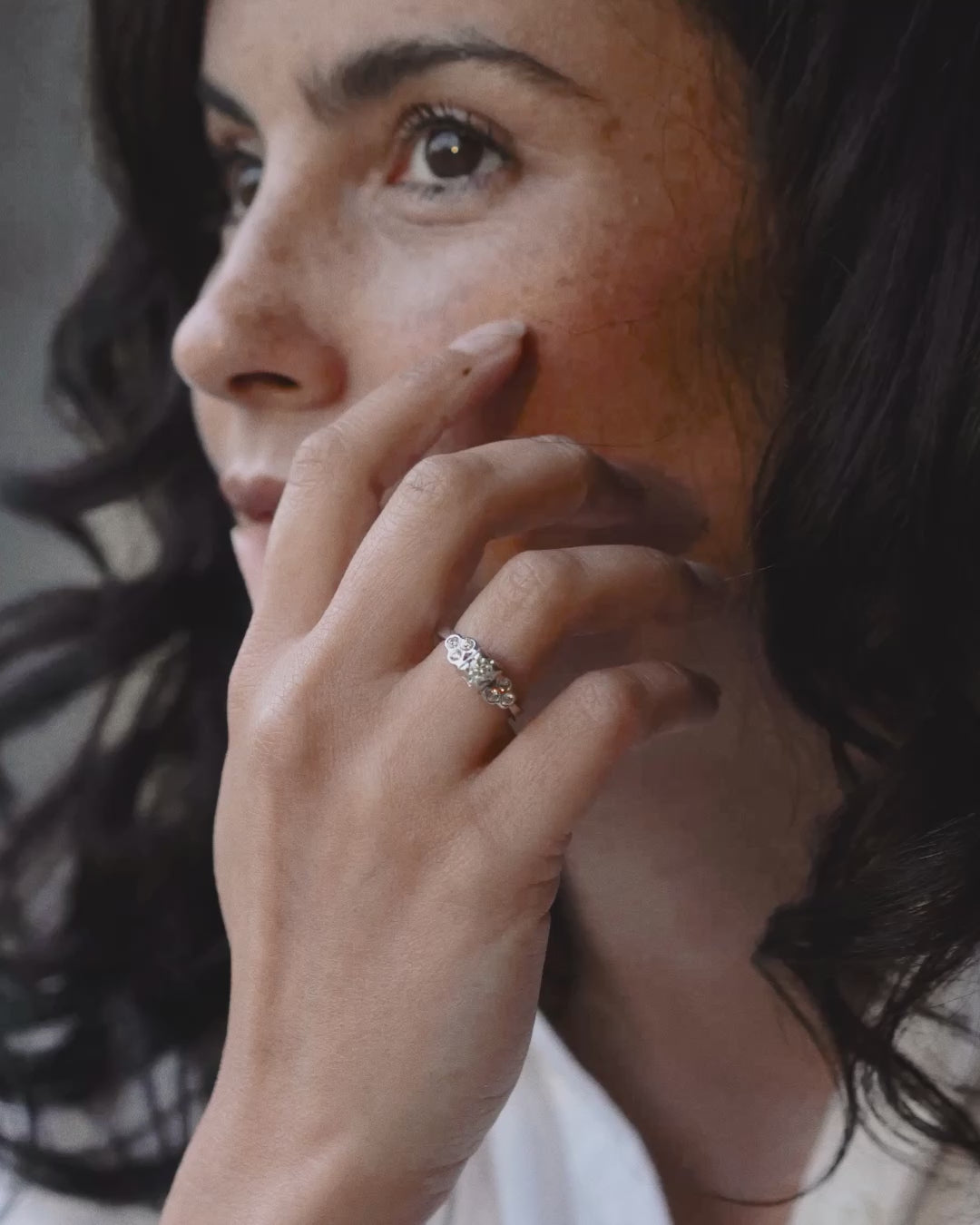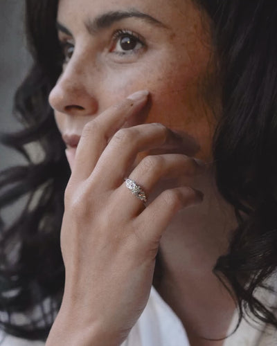 De Roos-ring is een schitterend samenspel van elegantie en vakmanschap. In het hart van de ring schittert een centrale briljant, omringd door kleinere diamanten met een totaalgewicht van 0.45 karaat. De 14K witgouden band accentueert de fonkeling van de stenen en geeft het ontwerp een moderne, verfijnde uitstraling. De clusterzetting zorgt voor een rijke schittering vanuit elke hoek, waardoor deze ring een perfecte keuze is voor wie houdt van subtiele luxe met karakter.