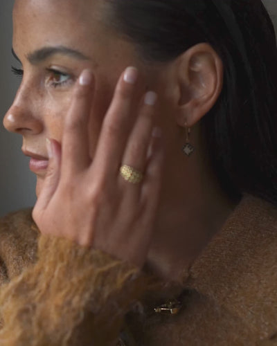 De Thalina ring is een waar eerbetoon aan vintage elegantie. Met haar opvallende structuur van verfijnde bolvormige details heeft deze ring een sculpturale uitstraling die zowel kracht als vrouwelijkheid uitstraalt. Het 9k ontwerp vangt het licht met een zachte, warme glans en vormt een statement van tijdloze stijl. Perfect om solo te dragen of te combineren met andere ringen voor een gelaagde, persoonlijke look. Dit bijzondere stuk werd met de hand uitgekozen bij een van de juweliers uit Menina’s wereldwijde netwerk, en is nu aangekomen in Amsterdam, klaar om een nieuw verhaal te beginnen met zijn toekomstige eigenares.