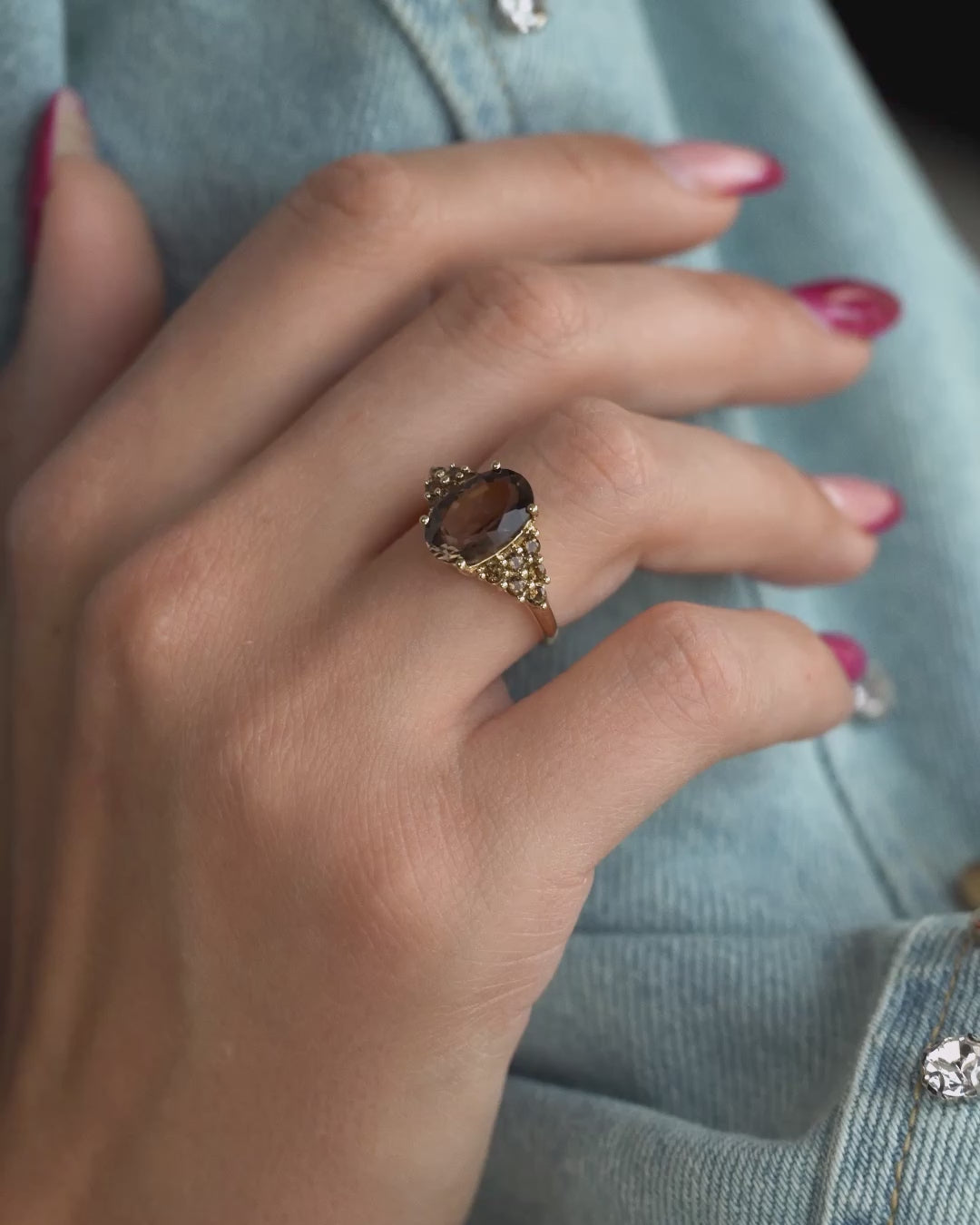 Deze stijlvolle vintage ring is bezet met een warme rookkwarts die een diepe, mysterieuze gloed uitstraalt. De steen is gezet in 9 karaat en geeft het ontwerp een krachtige en elegante uitstraling met een subtiele vintage charme. Dit bijzondere stuk is met zorg gevonden en met de hand geselecteerd via ons wereldwijde netwerk van juweliers. Na een prachtige reis naar Amsterdam is deze ring nu klaar om een nieuw verhaal te beginnen.