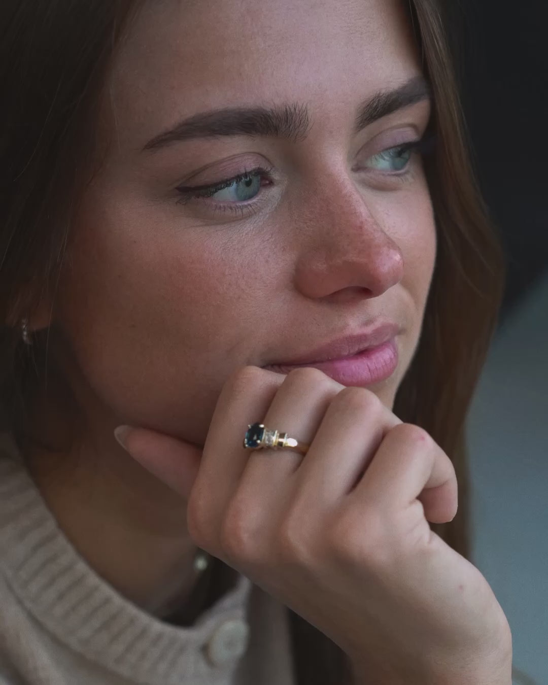 Verella vangt de serene diepte van een stille oceaan in haar hart. De ovale topaas straalt in koelblauw licht, omlijst door subtiele diamantaccenten die als kleine reflecties over het oppervlak dansen. De 9 karaat setting geeft de ring een zachte, klassieke glans – een perfecte balans tussen elegantie en ingetogen luxe.