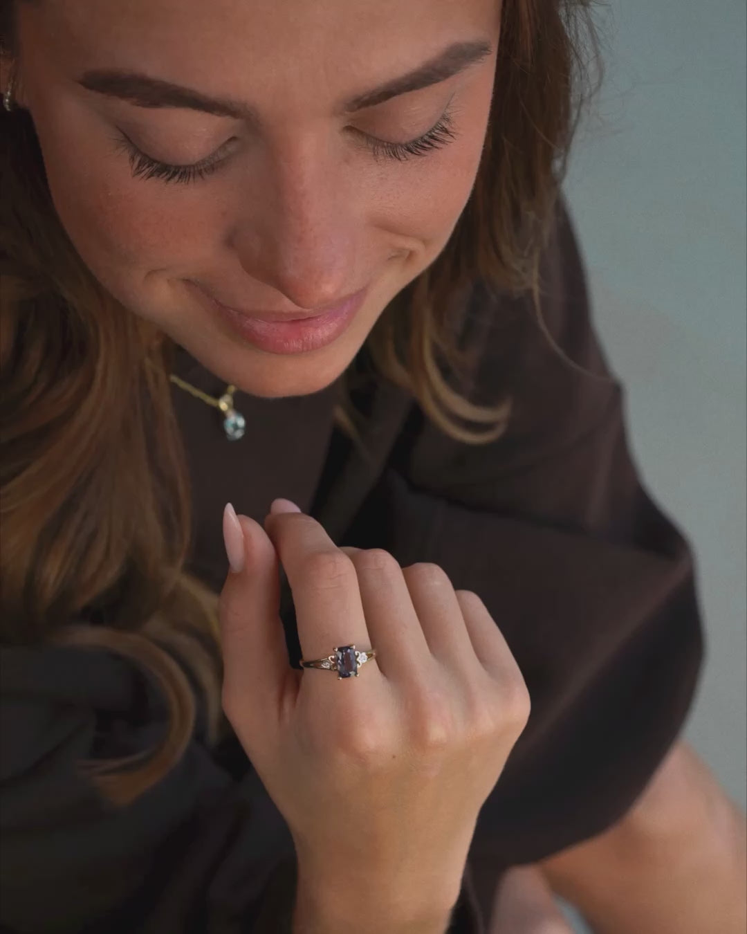 De Vionne ring is een verfijnde vintage creatie, gezet met een fascinerende ioliet die diep violette en blauwe tinten weerspiegelt in het licht. Aan weerszijden voegen kleine diamanten een subtiele schittering toe, waardoor de centrale steen nog meer tot leven komt. De combinatie van kleur en helderheid verleent dit sieraad een ingetogen allure — mysterieus, vrouwelijk en tijdloos. Met haar klassieke zetting en elegante vorm is Vionne een ring die elegantie fluistert in plaats van spreekt, een juweel dat moeiteloos een nieuw hoofdstuk begint in stijl en betekenis.