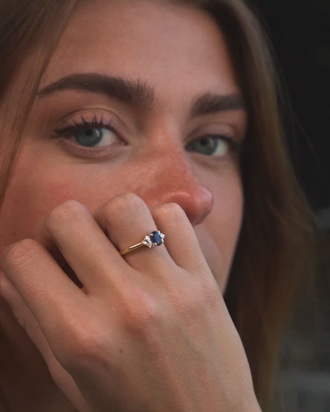 Althea weerspiegelt de elegantie van een nachtelijke hemel gevangen in edelsteen. De ovale saffier straalt in een diepe, fluweelblauwe tint, geflankeerd door twee heldere diamanten die haar glans versterken. De warme 9 karaat zetting omarmt het geheel met een zachte gloed, waardoor deze ring een verfijnde balans vormt tussen klassiek en betoverend.